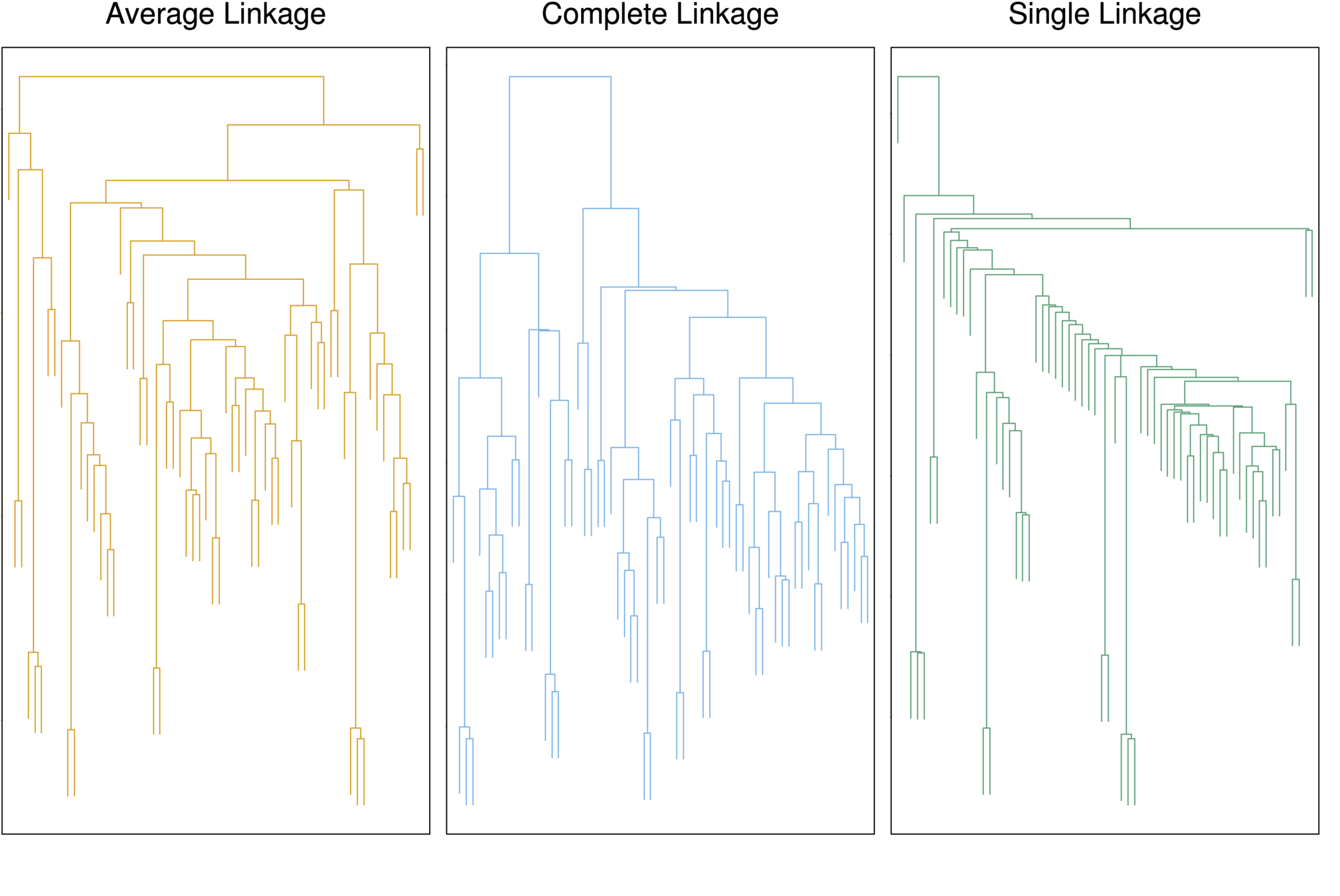 Minimal inter-cluster dissimilarity. Compute all pairwise dissimilarities between the observations in cluster A and the observations in cluster B, and record the smallest of these dissimilarities. |