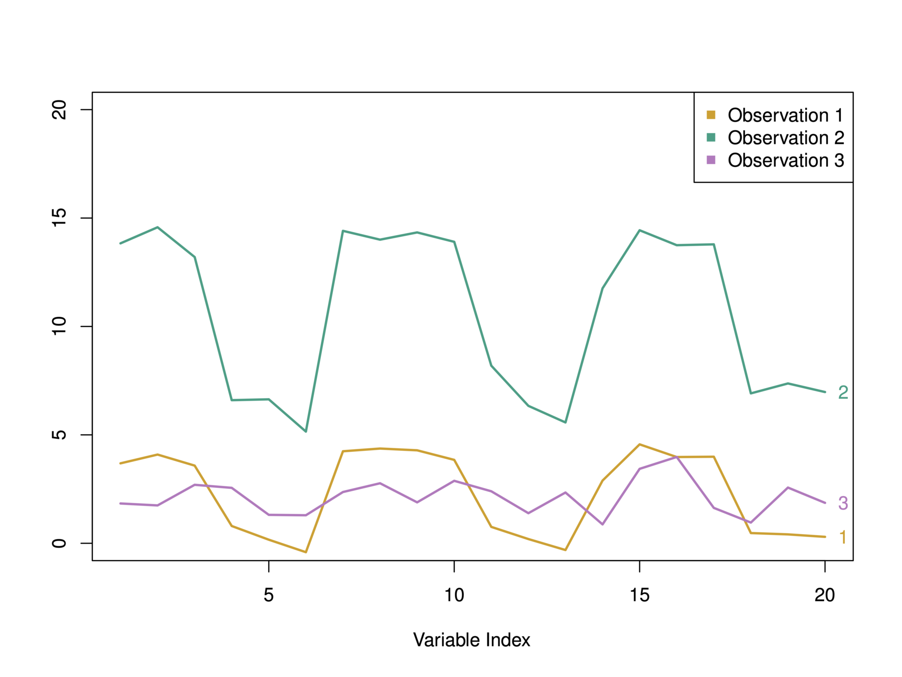 computed between variables; here it is computed between the observation profiles for each pair of observations.