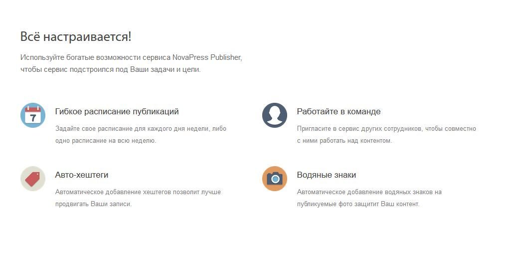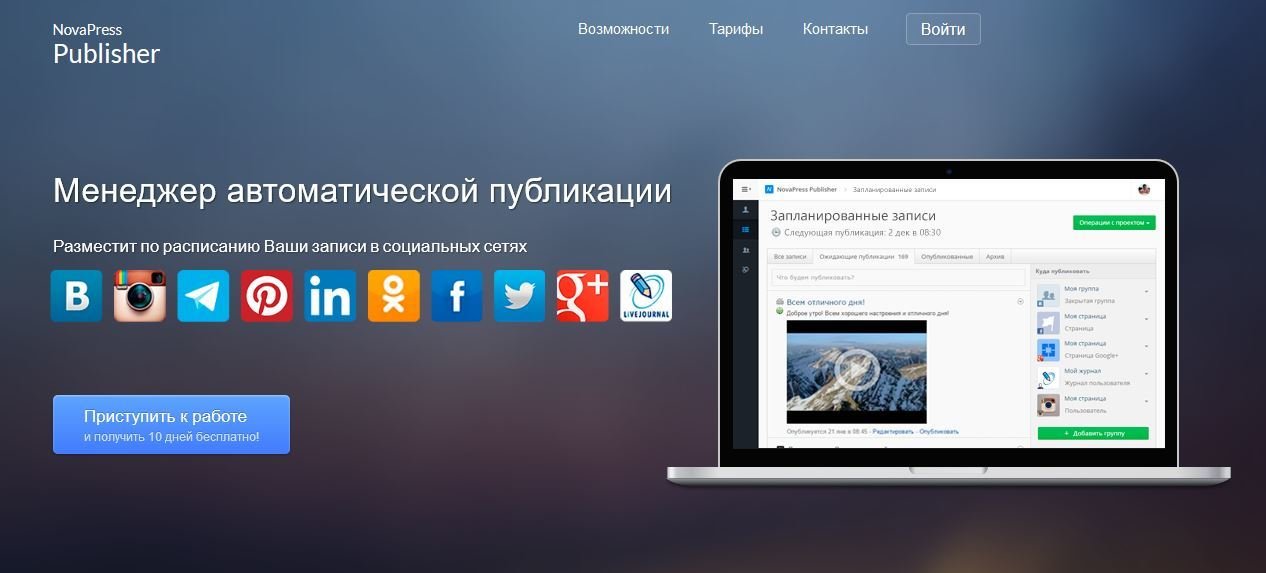 NovaPress Publisher — это веб-сервис для отложенной публикации постов в соцсети. Автоматическая публикация поддерживается во Вконтакте, Facebook и другие сети.