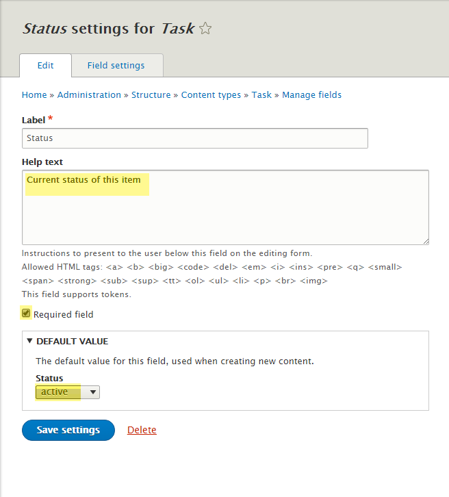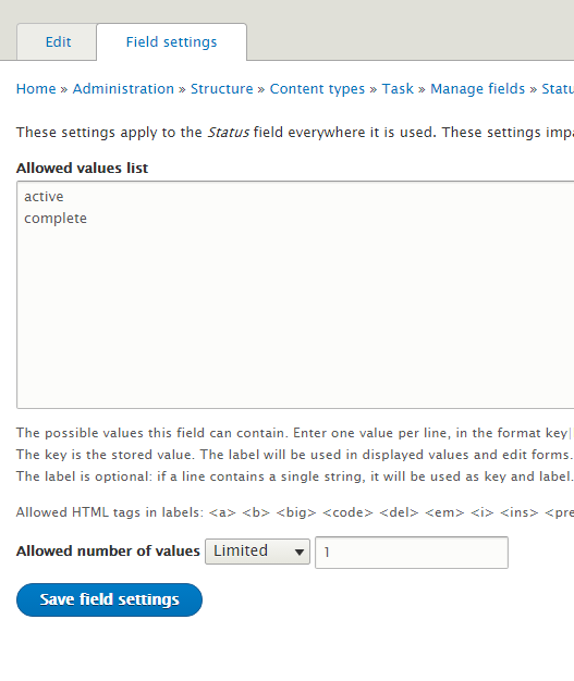 A "Field Type" defines the kind of information you want to store in the field. Drupal has field types for: