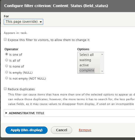 Instead of exposing the "status" filter, we'll fix it to "completed"