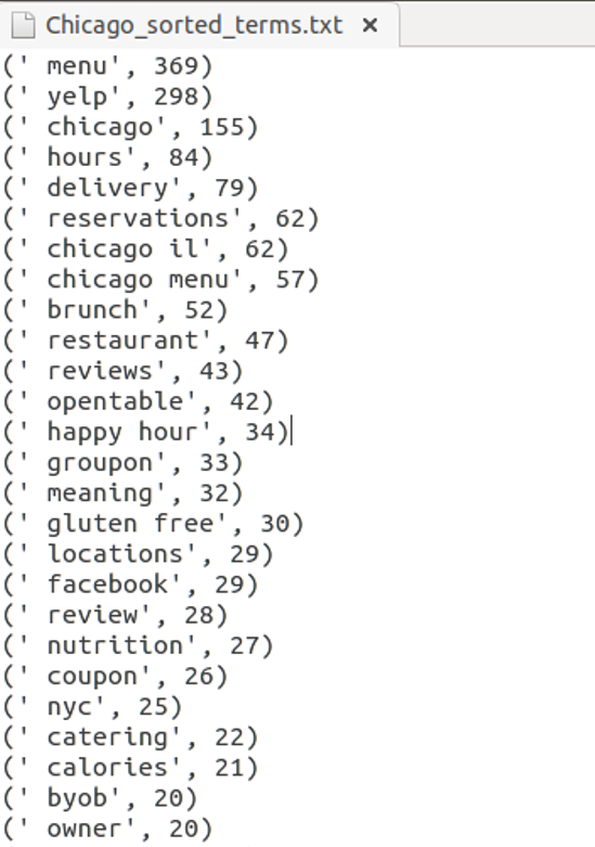- Produces a sorted list of the most common phrases and how many times they have occurred within the input file