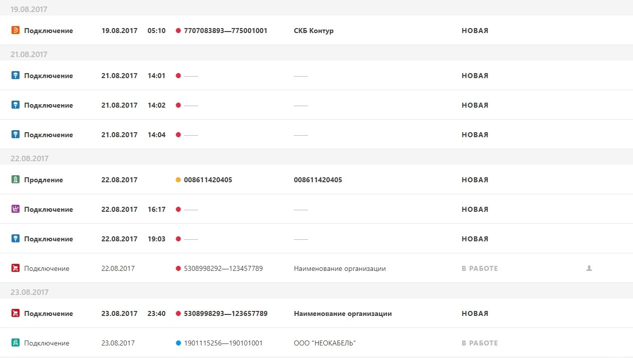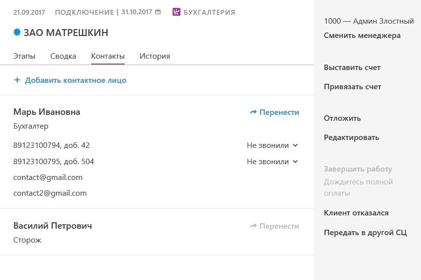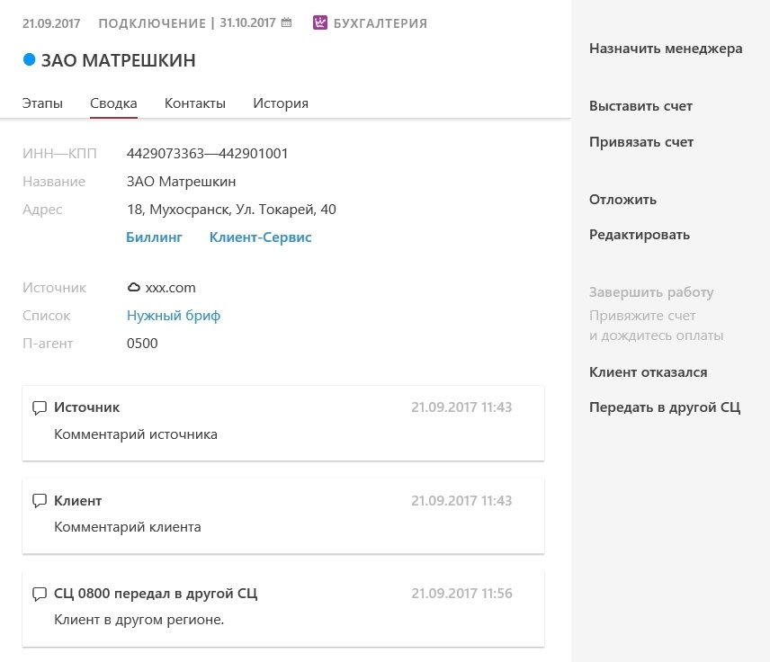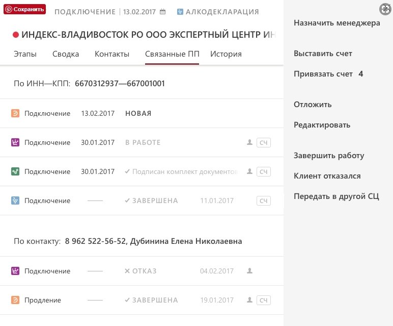 -- информация о контрольных звонках, обратной связи фиксируется в собственных CRM.