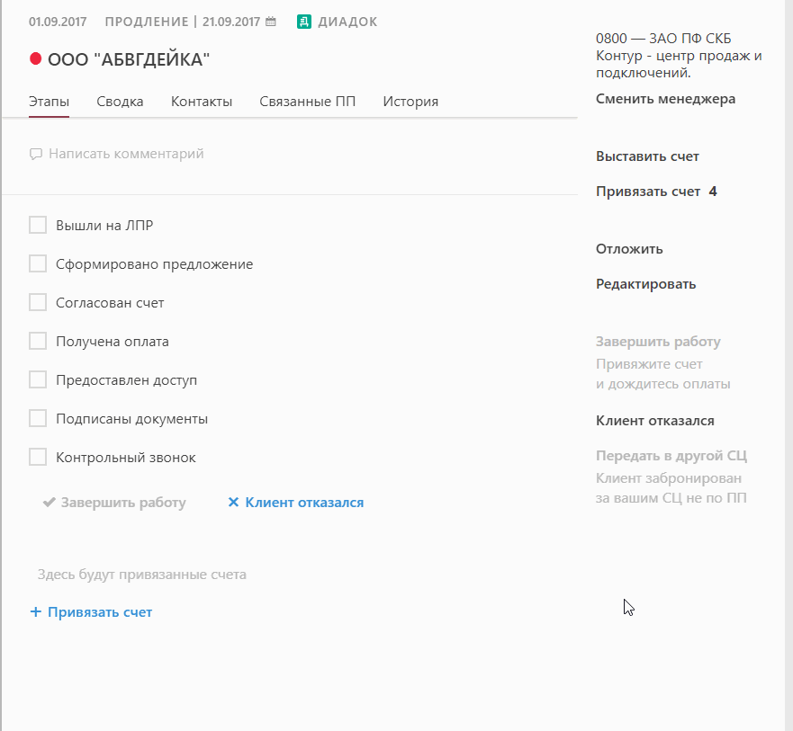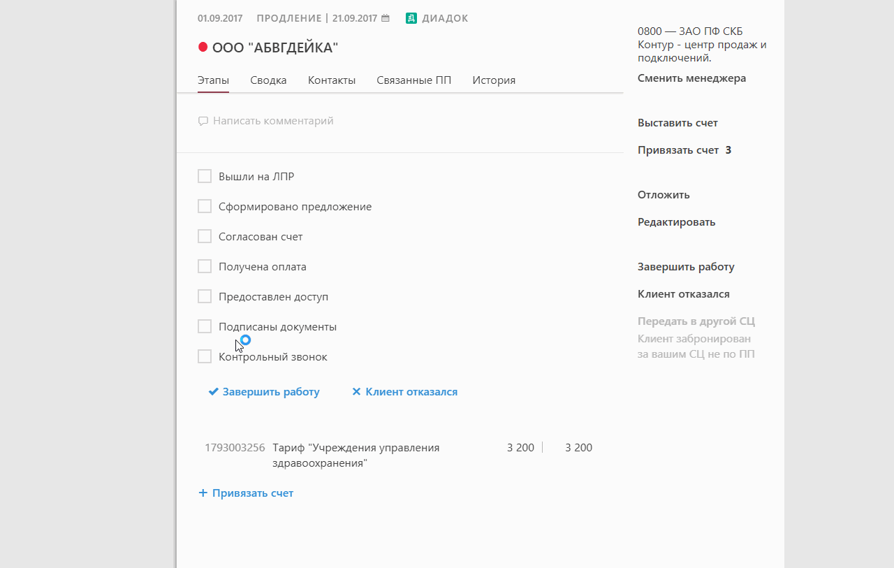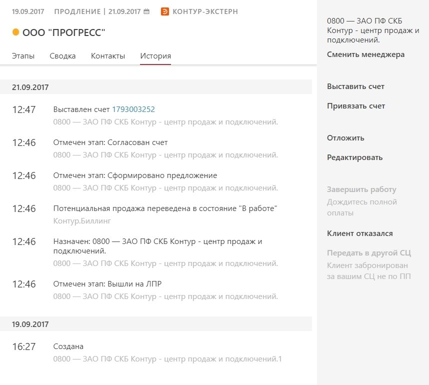 Контур не владеет достоверными данными, о том, какие этапы проходят менеджеры при продаже продуктов Контура, обслуживании клиентов → нет понимания, какова длина сделки, на каких этапах клиент отказывается от покупки продукта, по каким вопросам клиент обращался → планирование и выводы делаются наугад. Нужен инструмент, который позволит собирать такую информацию для грамотного планирования продаж.