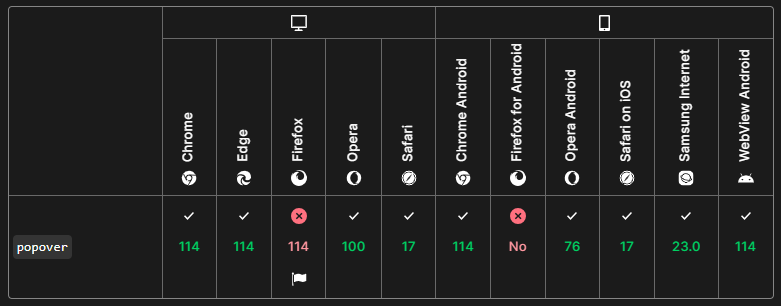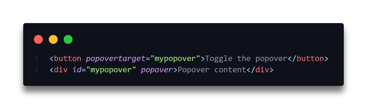 The Popover API provides developers with a standard, consistent, flexible mechanism for displaying popover content on top of other page content. Popover content can be controlled either declaratively using HTML attributes, or via JavaScript.