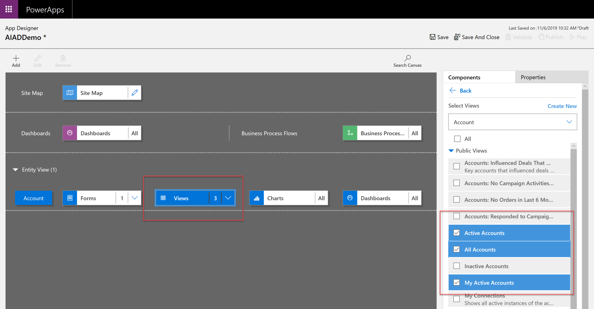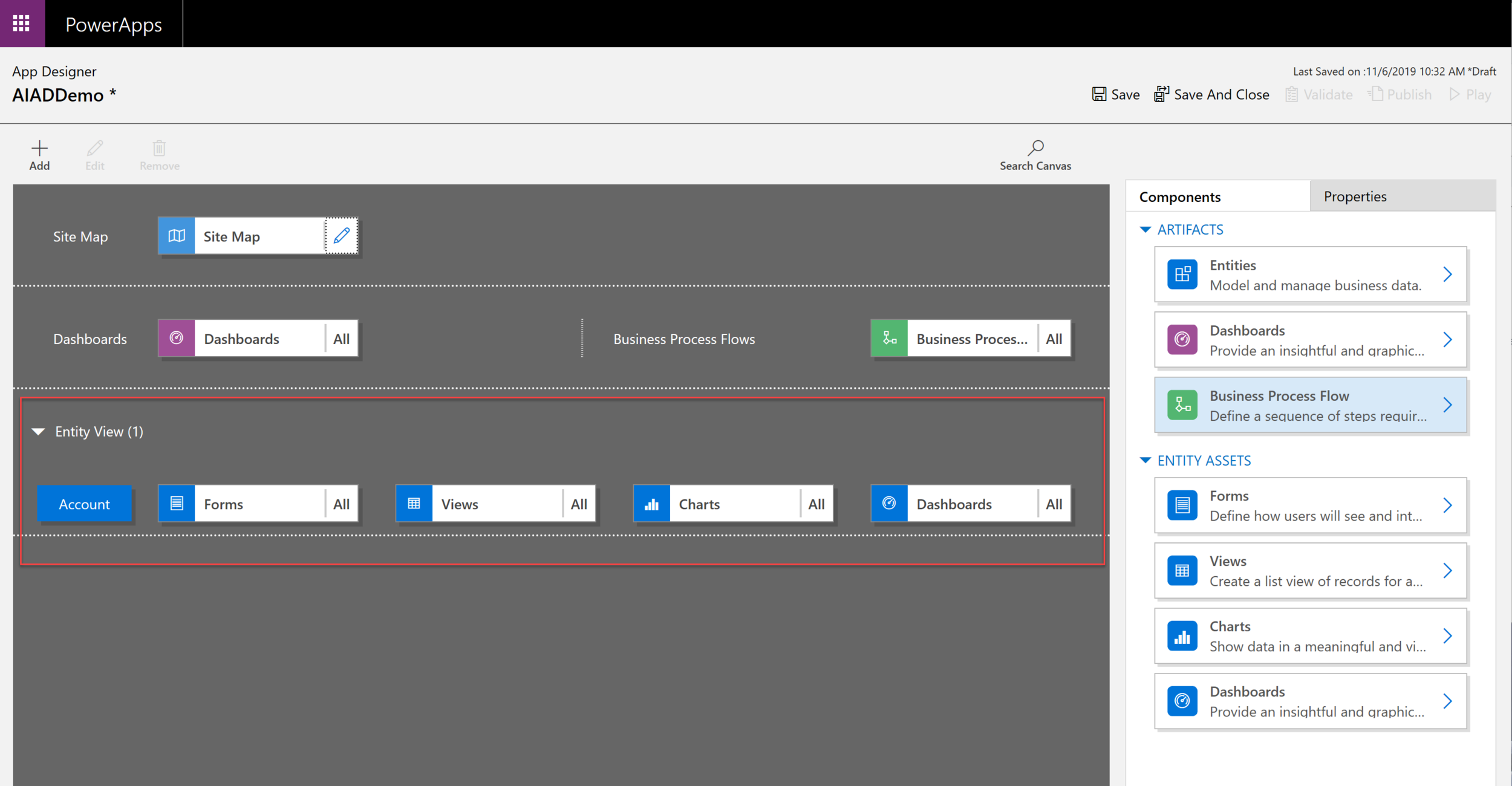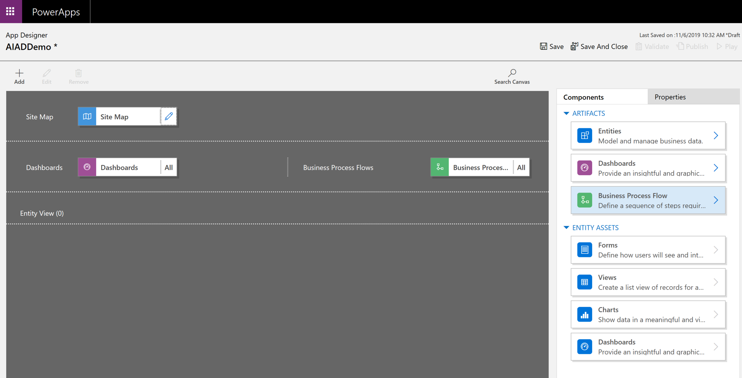 Adding an Entity automatically adds Forms, Views, Charts and a Dashboard