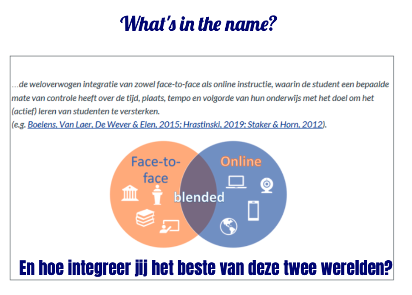 Dit betekent niet dat zowel face-to-face als afstandsactiviteiten moeten geïntegreerd worden. Dit betekent niet dat je moet werken met een gamma aan onderwijstechnologie.