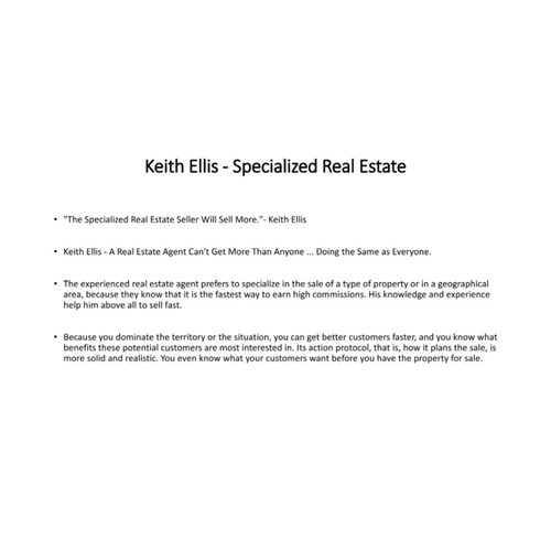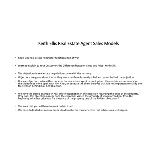 Keith Ellis Real Estate Agent Sales Models Ketih Ellis Real estate negotiator functions: tug of war Learn to Explain to Your Customers the Difference between Value and Price- Keith Ellis The objections in real estate negotiation come with the territory. Objections are generally not what they seem, as there is usually a hidden reason behind the objection. Unclear objections arise either because the real estate agent has not gained the confidence necessary for the client to be more open with him / her, or because the client believes that it is not important to clarify the true reason behind his / her objection. If you are selling the house with the highest available price, you need to attract the right buyers and know how to make sure your buyers understand what makes your house worth the money. Keith Ellis Estate agents need to have a good idea of what makes a house different from other luxury properties in your area. How best to negotiate the sale price of a luxury property in the area? In addition to home pricing, a reputable broker has a number of marketing options for a luxury home. The marketing of luxury properties is targeted through e-mail and community advertising.