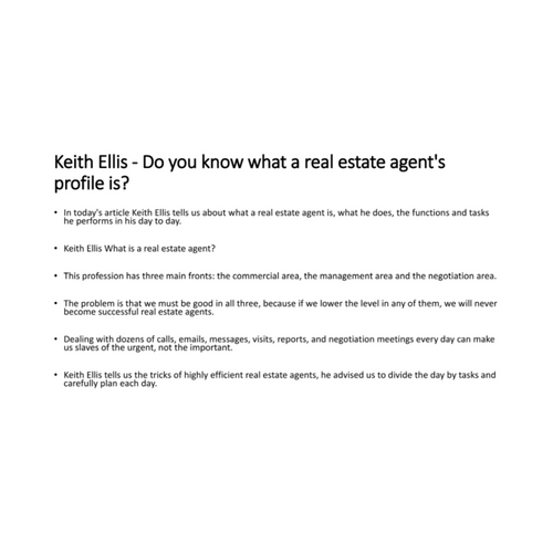 Keith Ellis - Do you know what a real estate agent's profile is? In today's article Keith Ellis tells us about what a real estate agent is, what he does, the functions and tasks he performs in his day to day.