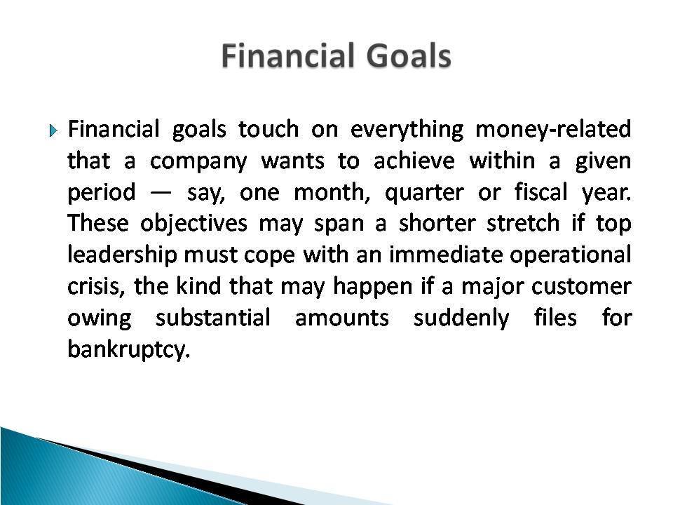 Financial goals touch on everything money-related that a company wants to achieve within a given period — say, one month, quarter or fiscal year. These objectives may span a shorter stretch if top leadership must cope with an immediate operational crisis, the kind that may happen if a major customer owing substantial amounts suddenly files for bankruptcy.