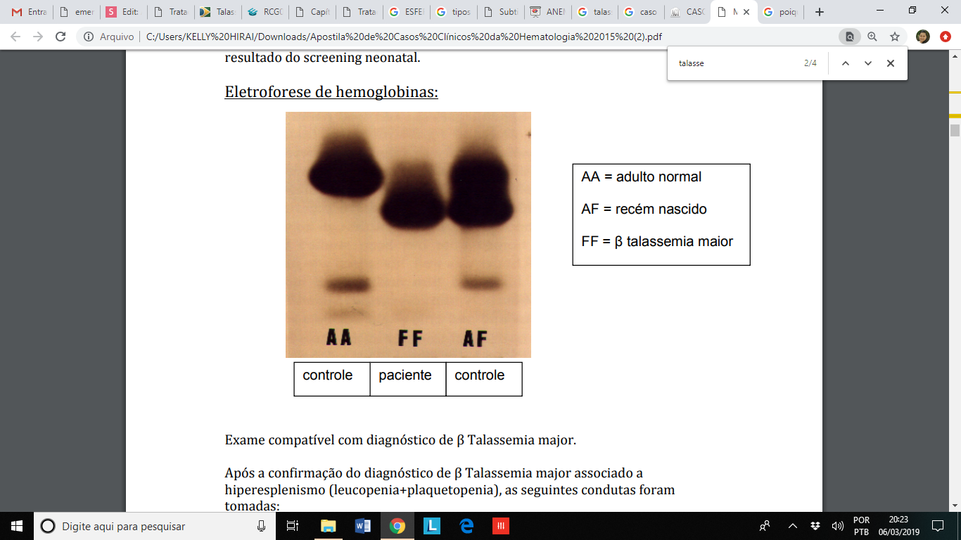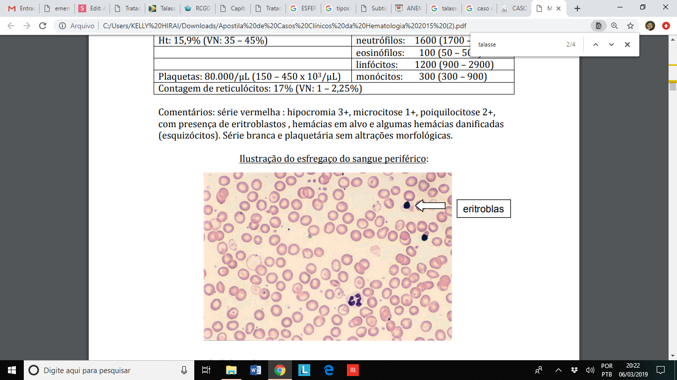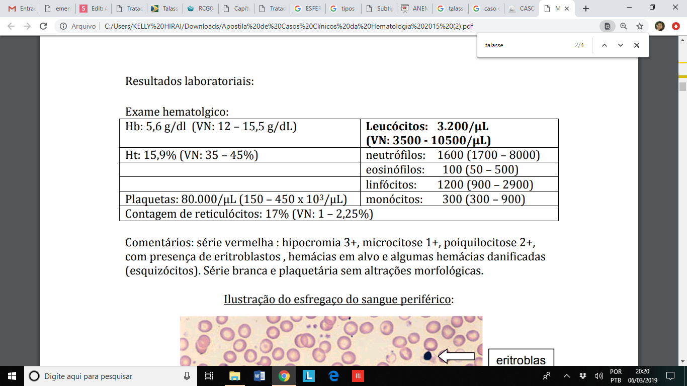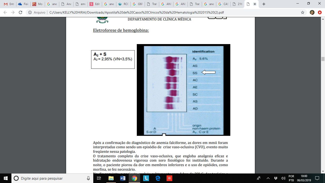 QUEIXA: O paciente refere que, há cerca de 3 dias, começou a sentir dores em membros inferiores. As dores nas pernas se iniciam de forma abrupta e progressiva. Hoje, pela manhã, fez um hemograma em sua cidade e foi constatado anemia grave. Foi encaminhado a este serviço para investigar a causa da anemia e da dor em membros inferiores. No momento da admissão na Unidade de Emergência, referia dores em membros inferiores de forte intensidade. Referia que desde criança sentia dores pelo corpo esporadicamente, semelhante ao quadro atual.