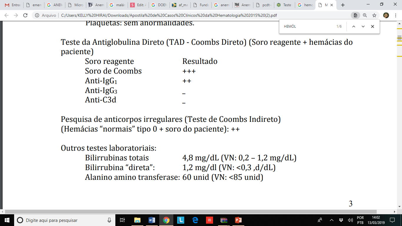Teste para comprovação de hemólise: caracteriza-se por aumento de reticulócitos e desidrogenase láctica (DHL). A bilirrubina indireta pode estar elevada nos pacientes com hemólise grave.