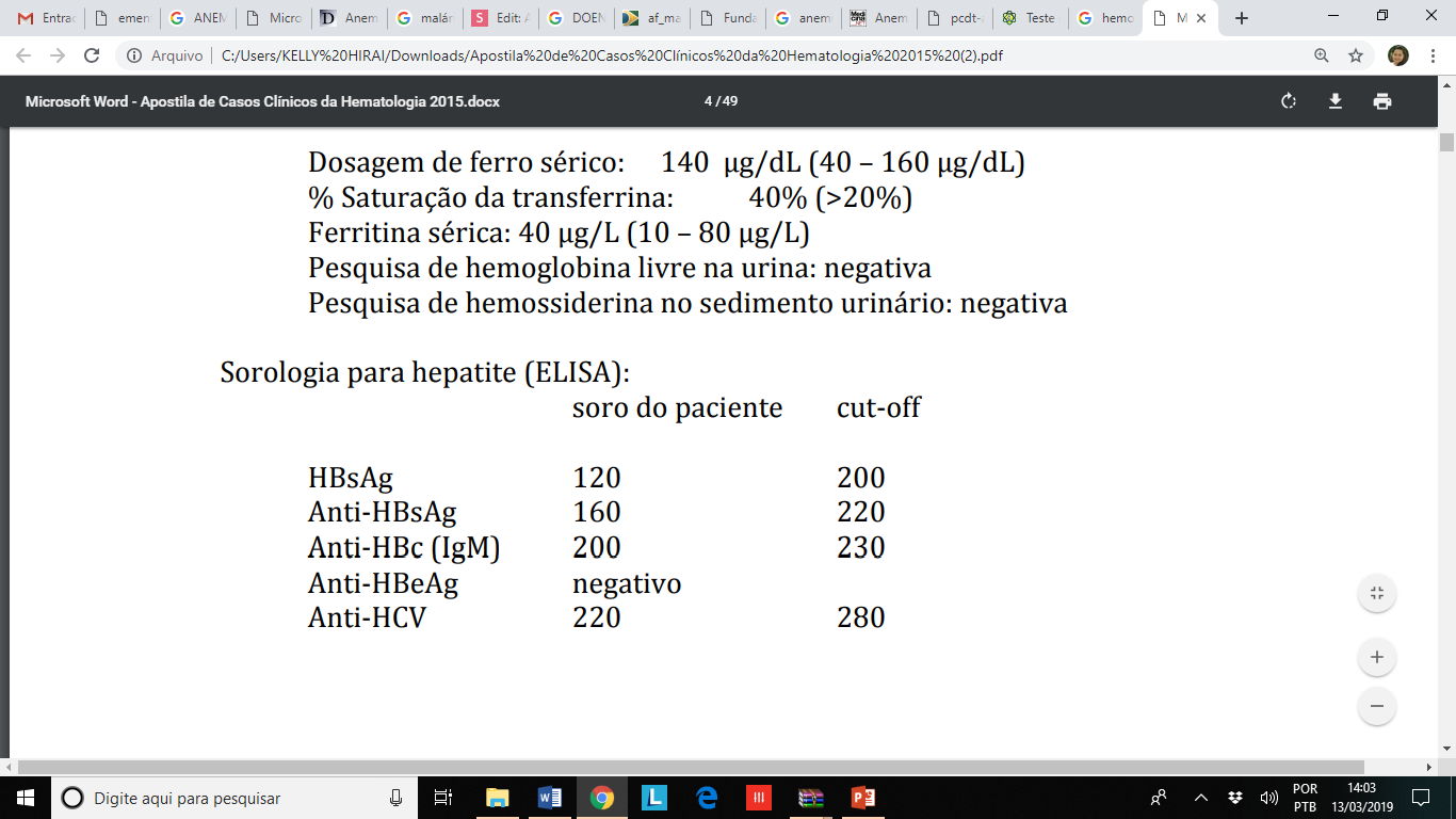 Hemograma: deve evidenciar anemia caracterizada por hemoglobina abaixo de 13 g/dL em homens e abaixo de 12 g/dL em mulheres.