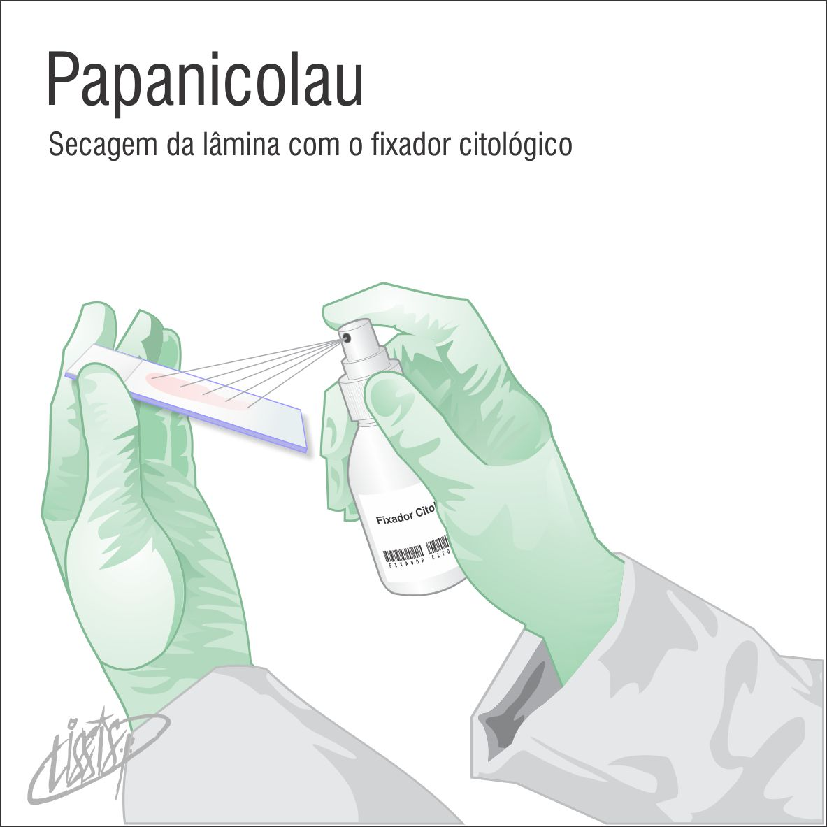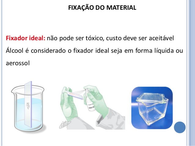 Coloca-se a lâmina com o esfregaço dentro do frasco com álcool a 95% em quantidade suficiente para que todo o esfregaço seja coberto ou utilizar spray com solução fixadora.