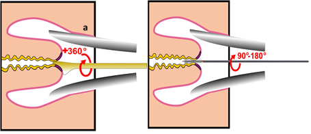 A escova deve ser inserida no orifício externo do colo e girada em um movimento de 90º-180º em sentido horário.
