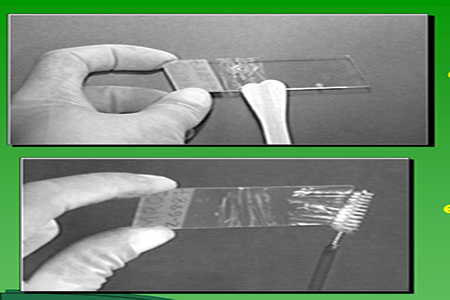 Após a coleta, esse material deve ser distendido de maneira uniforme, no sentido transversal, na metade superior da lâmina (próximo da área fosca),previamente identificada com as iniciais da mulher.