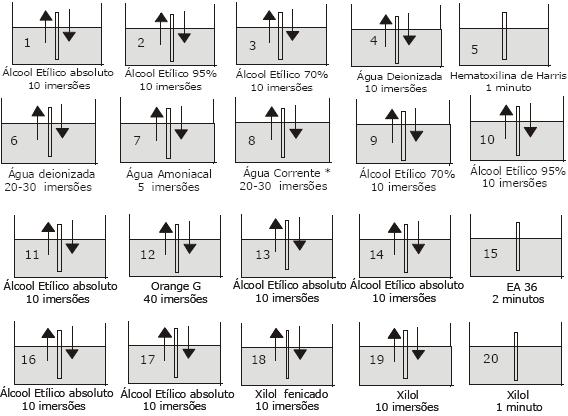 Hidratação: esta etapa requer a reposição gradual da água das células por meio de banhos alcoólicos de concentrações decrescentes até a água destilada.