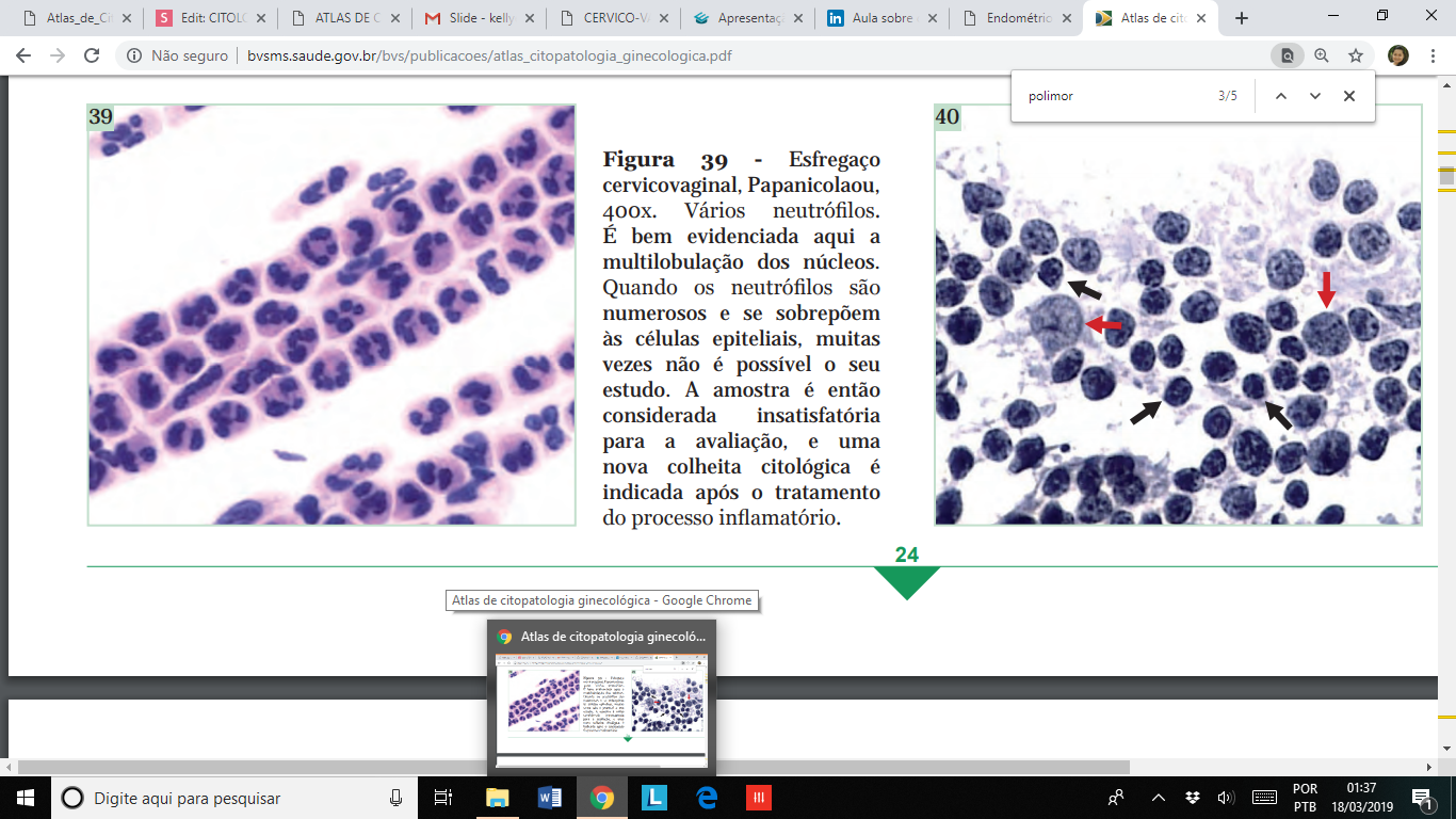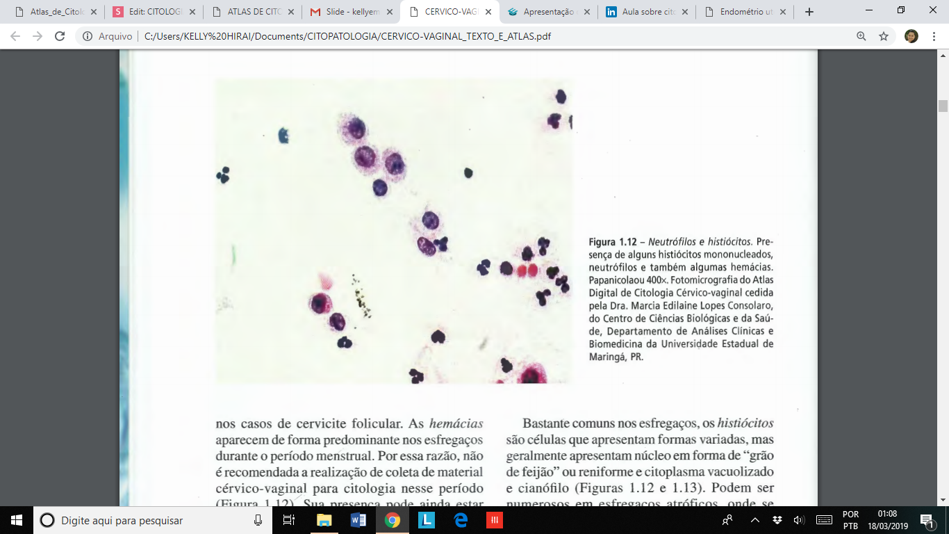 A presença de leucócitos, principalmente de neutrófilos segmentados, desde que em pequeno número, constitui um achado frequente no esfregaço cérvico-vaginal, variando de acordo com o período do ciclo menstrual.