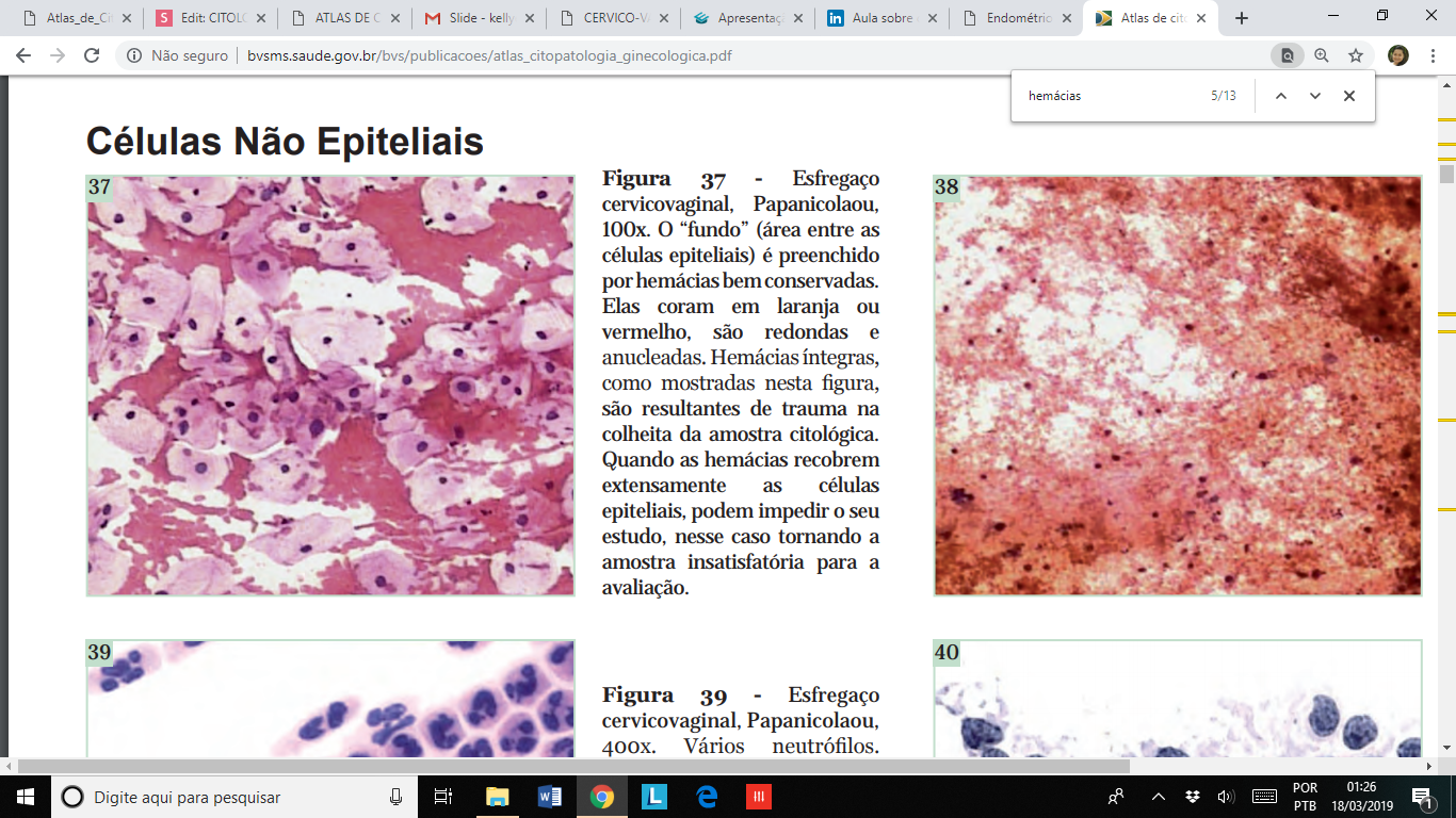 Hemácias aparecem de forma predominante nos esfregaços durante o período menstrual ou ulcerações, traumas durante a coleta ou casos de câncer cervical.