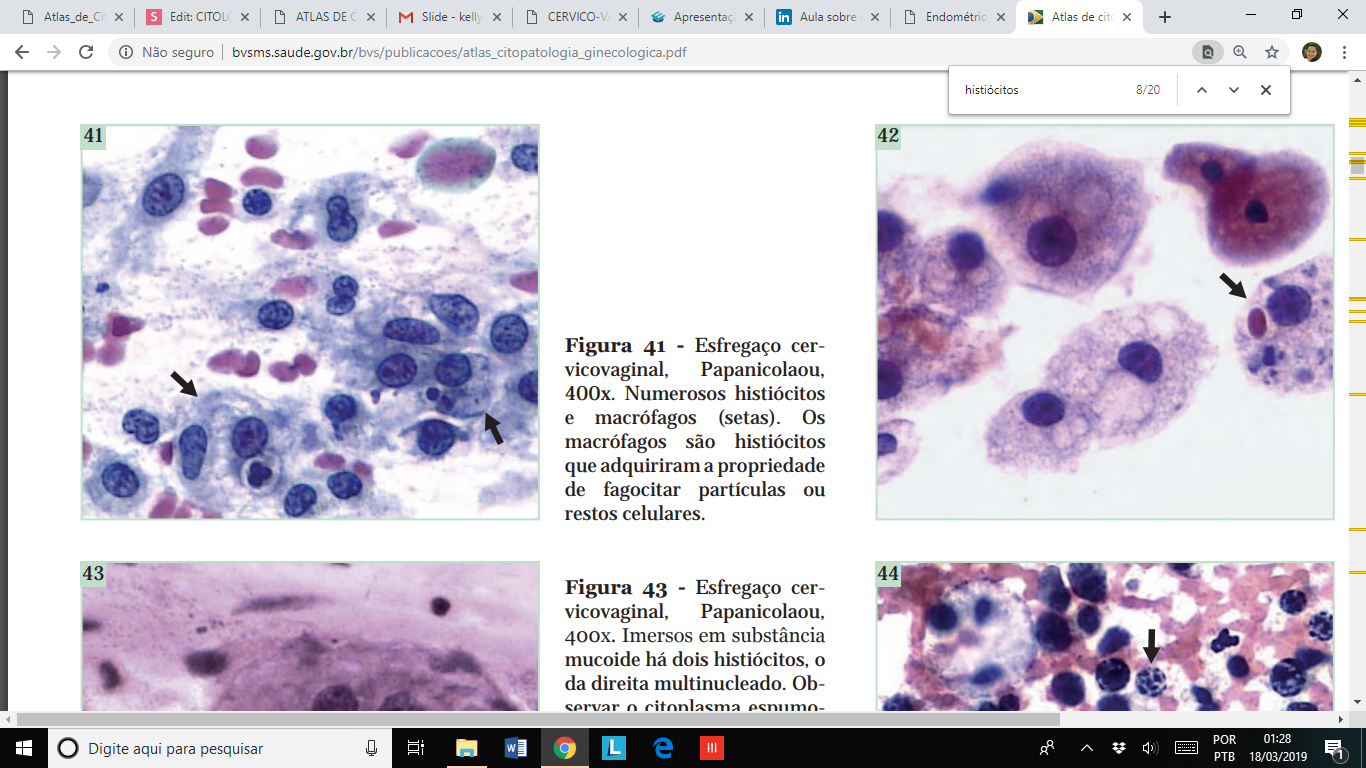 Histiócitos são bastante comuns em esfregaço cérvico-vaginal, apresentam forma variada, mas geralmente apresentam núcleos em forma de "grão de feijão"