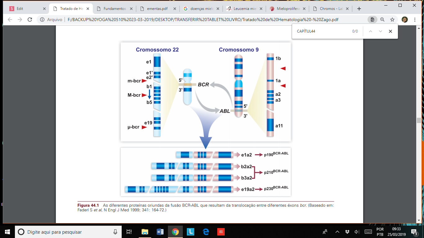 A Leucemia Mieloide Crônica (LMC) é uma doença clonal da célula progenitora hematopoética, caracterizada pela presença do cromossomo Filadélfia (cromossomo Ph ou Ph1), produto da translocação t(9;22)(q34;p11) e que resulta na fusão dos genes ABL e BCR, gerando um novo gene híbrido e anormal: o gene BCR-ABL.