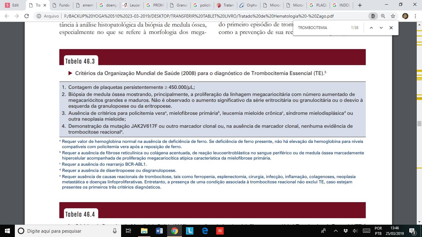 A TE é uma neoplasia mieloproliferativa crônica BCR-ABL1-negativa que envolve, primariamente, a linhagem megacariocitária e que se caracteriza por trombocitose sustentada no sangue periférico, aumento do número de megacariócitos maduros e grandes na medula óssea, e, clinicamente, por episódios de trombose e/ou de sangramentos e fenômenos vasomotores.