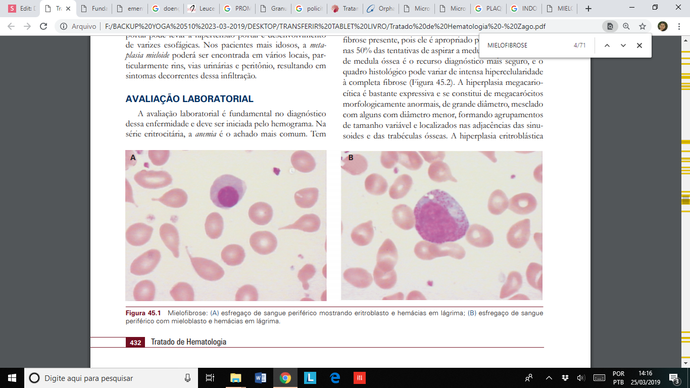 A MF caracteriza-se por esplenomegalia, presença de leucoeritroblastose e células em gota (dacriócitos) no sangue periférico, medula óssea com variado grau de fibrose e hematopoese extramedular.