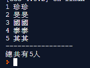 print('總共有%d人' % cnt)程式碼 (方法不只一種)