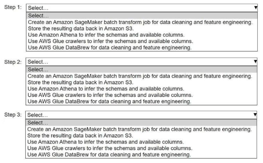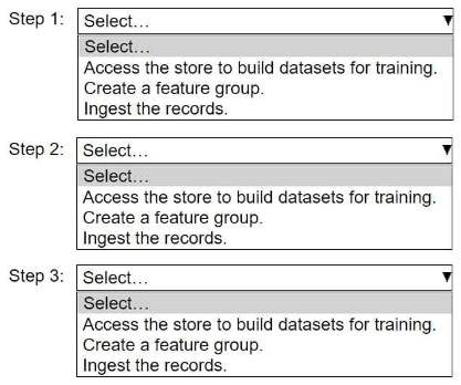 Select and order the steps from the following list to create and use the features in Feature Store. Each step should be selected one time. (Select and order three.)