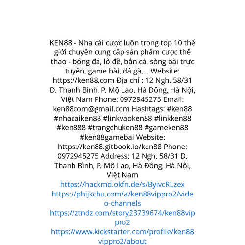 Website: https://ken88.gitbook.io/ken88 KEN88 - Nha cái cược luôn trong top 10 thế giới chuyên cung cấp sản phẩm cược thể thao - bóng đá, lô đề, bắn cá, sòng bài trực tuyến, game bài, đá gà,... Website: https://ken88.com Địa chỉ : 12 Ngh. 58/31 Đ. Th