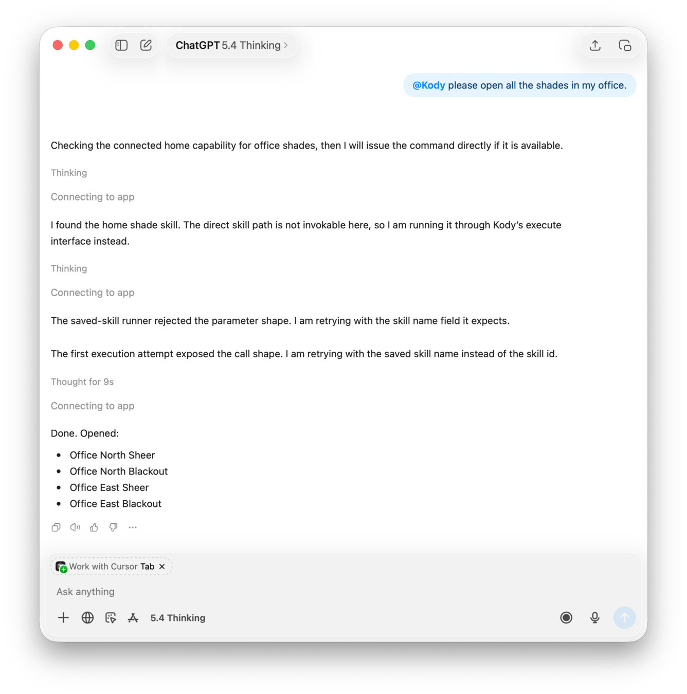 - **Kody integration-backed app workflow** (workflow): Confirm the connector exists, run one authenticated smoke test, then build or use the dependent package workflow.