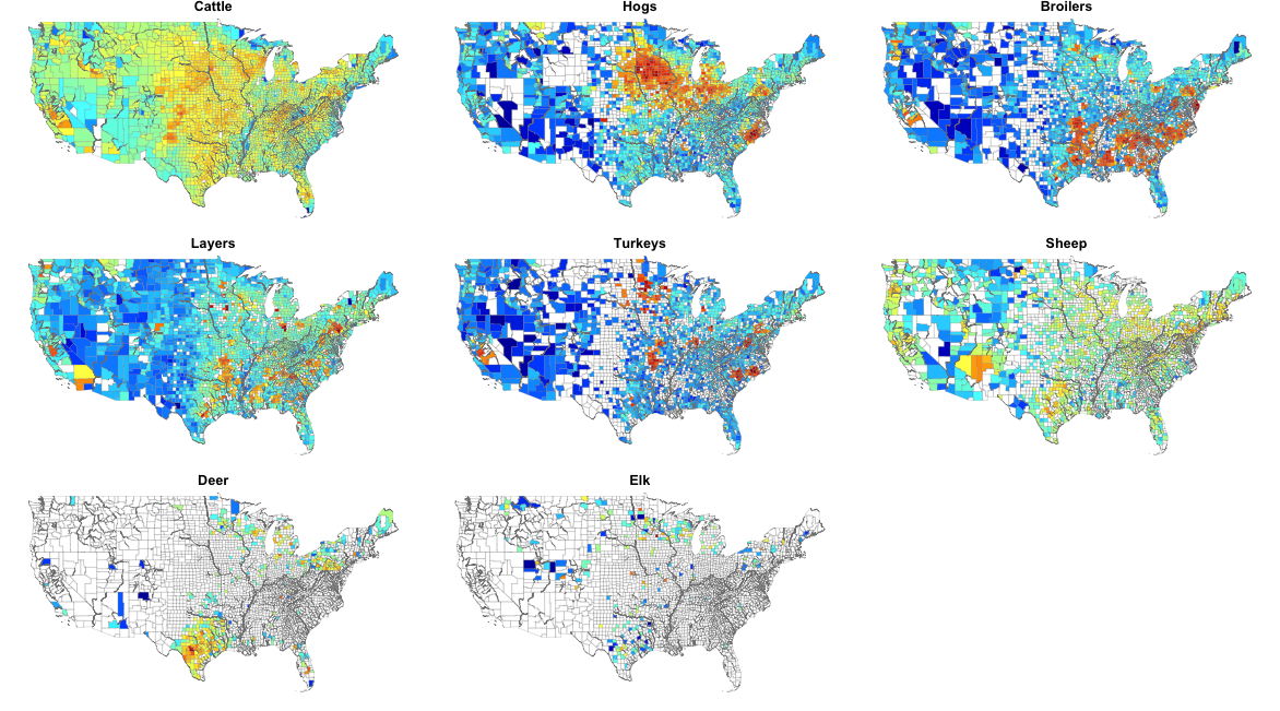 | Pathogen | Median domestic operation size | Median operations per producing county | Proportion of counties with production | Vaccine cost | Treatment/Post-exposure prophylaxis cost | Diagnostic cost | Fencing cost | Indemnity cost per animal |