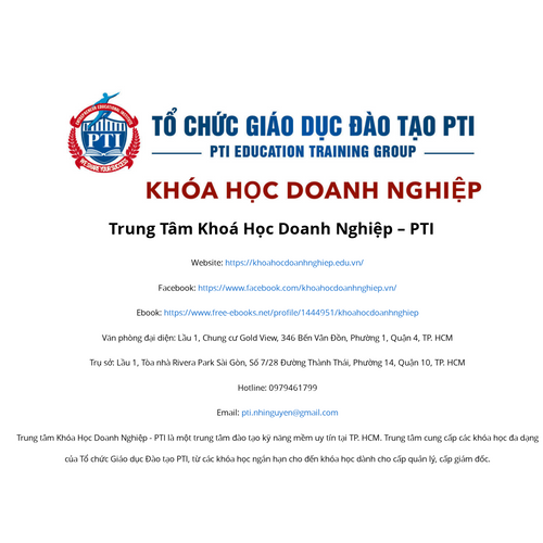 Facebook: https://www.facebook.com/khoahocdoanhnghiep.vn/ Ebook: https://www.free-ebooks.net/profile/1444951/khoahocdoanhnghiep Trụ sở: Rivera Park Sài Gòn, 7/28 Thành Thái, Quận 10, TP. HCM Hotline: 0979461799 Email: pti.nhinguyen@gmail.com
