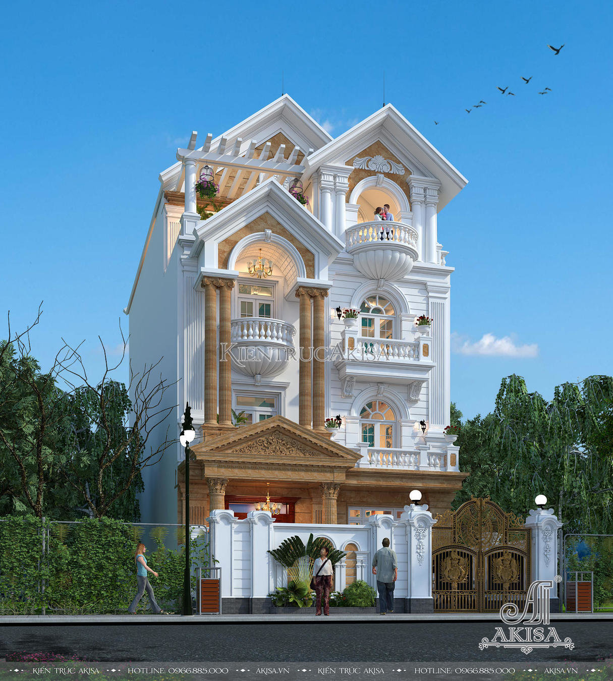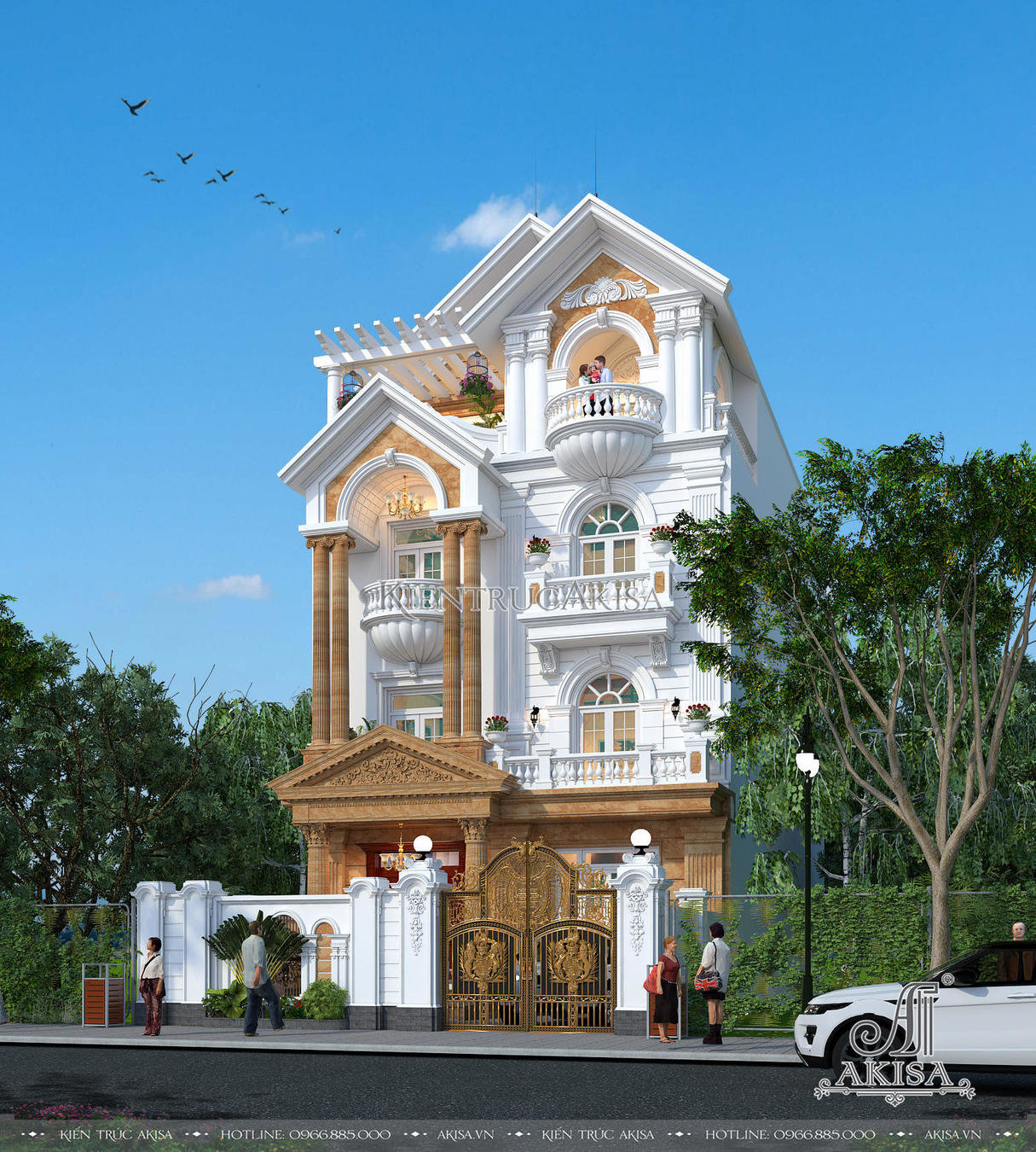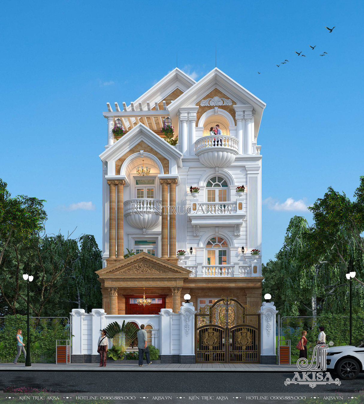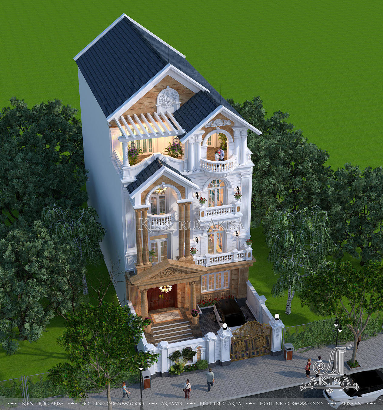 Phối cảnh từ trên cao cho phép chiêm ngưỡng trọn vẹn vẻ đẹp của ngôi biệt thự tân cổ điển 4 tầng kiểu Pháp. Thay vì lựa chọn mái mansard bề thế, cầu kỳ, chủ đầu tư và các kiến trúc sư đã thống nhất thiết kế hệ mái Thái cao ráo màu xanh than lịch lãm, dáng mái chữ A cân đối, viền mái được phào chỉ trắng tinh tế mang đến vẻ đẹp thanh thoát, sang trọng đậm chất Á Đông, đồng thời tiết kiệm chi phí và thời gian thi công.