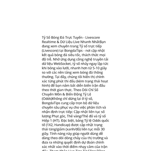Website: https://bongdatips.net/https://bongdatips.net/ Tỷ Số Bóng Đá Trực Tuyến - Livescore Realtime & Dữ Liệu Live Nhanh NhấtBạn đang xem chuyên trang Tỷ số trực tiếp (Livescore) tại BongdaTips - nơi cập nhật kết quả bóng đá siêu tốc, thách thức mọi độ trễ. Nhờ ứng