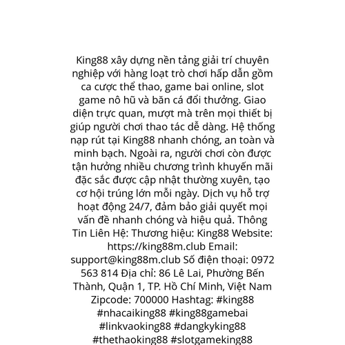 Website: https://king88m.club. King88 xây dựng nền tảng giải trí chuyên nghiệp với hàng loạt trò chơi hấp dẫn gồm ca cược thể thao, game bai online, slot game nô hũ và băn cá đổi thưởng. Giao diện trực quan, mượt mà trên mọi thiết bị giúp người chơi