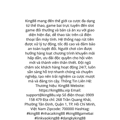 Website: https://king88u.vip. King88 mang đến thế giới ca cược đa dạng từ thể thao, game bai trực tuyến đến slot game đổi thưởng và băn cá ăn xu với giao diện hiện đại, dễ thao tác trên cả điện thoại lẫn máy tính. Hệ thống nạp rút tiền được xử lý tự