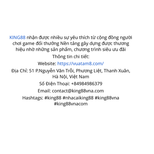 KING88 nhận được nhiều sự yêu thích từ cộng đồng người chơi game đổi thưởng Nền tảng gây dựng được thương hiệu nhờ những sản phẩm, chương trình siêu ưu đãi Thông tin chi tiết: Website: https://vuatam8.com/ Địa Chỉ: 51 P.Nguyễn Văn Trỗi, Phương Liệt, Thanh Xuân, Hà Nội, Việt Nam Số Điện Thoại: +84984986379 Email: contact@king88vna.com Hashtags: #king88 #nhacaiking88 #king88vna #king88vnacom