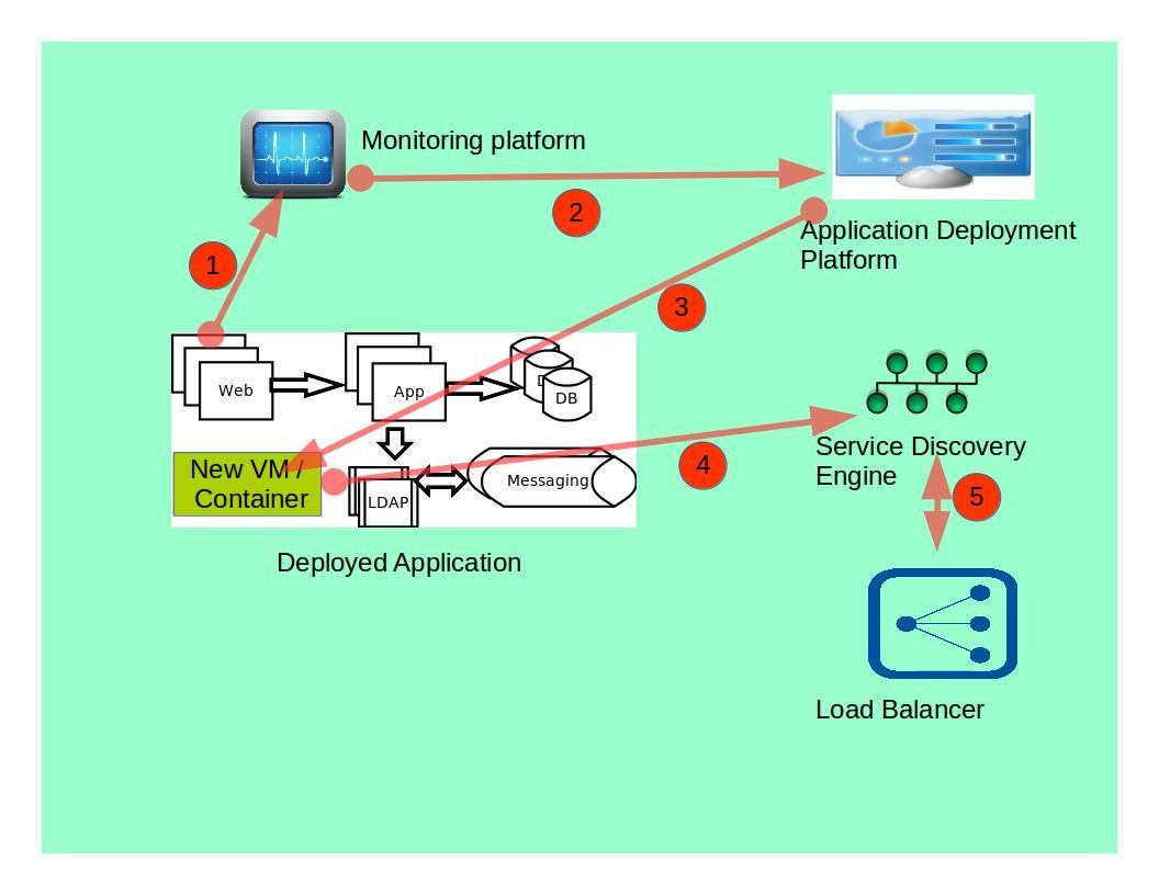 - Monitoring platform detects threshold and signals Application Deployment Platform to deploy additional capacity