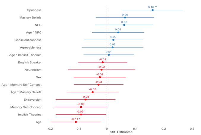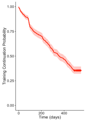 A survival analysis indicated that age (+ve), openness to experience (+ve), and need for cognition (-ve) predicted continuation with training (all p < .05)