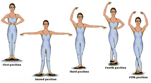 - Vastleggen gangbare balletpassen: uitdraaien van voeten en benen vanuit de heupen (en dehors) --> 5 basisposities voor de voeten