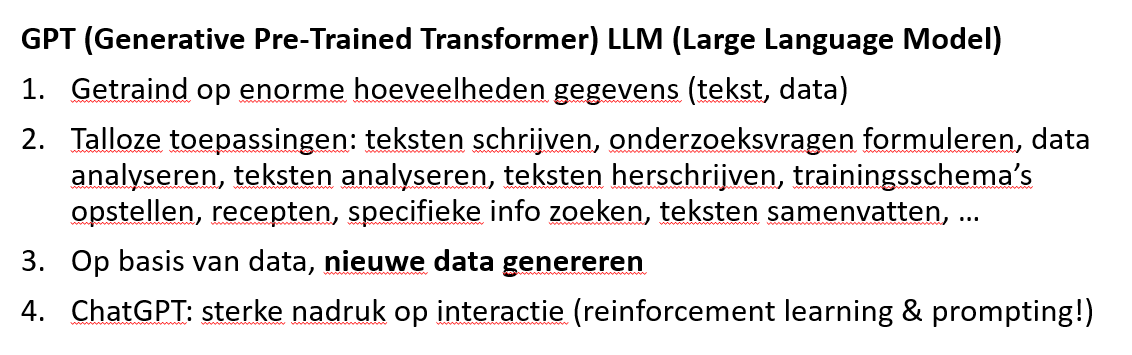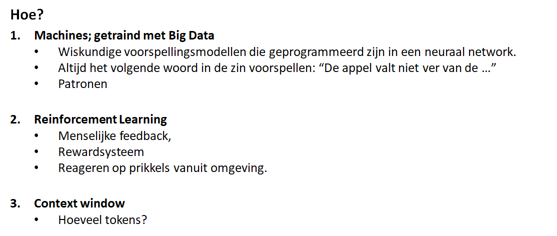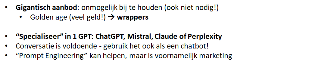- Welke GPT je kiest, hangt af van context window (aantal tokens dat het kan verwerken) en gebruiksgemak.