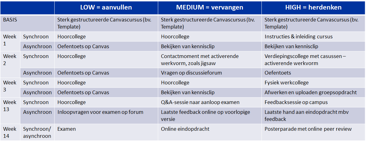 Low = verrijkte virtuele omgeving. The digitale structuur reflecteert de algemene organisatie van het vak. Het biedt zo de mogelijkheid tot formatief handelen (Q&A, discussies, geautomatiseerde quizzes, opdrachten, ...)