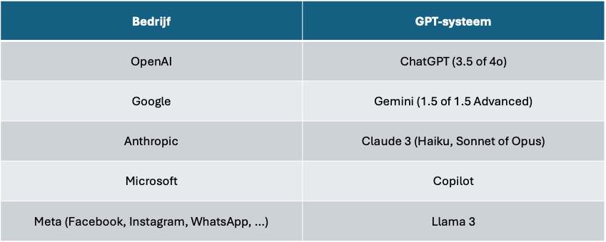 - Welke GPT je kiest, hangt af van context window (aantal tokens dat het kan verwerken) en gebruiksgemak.
