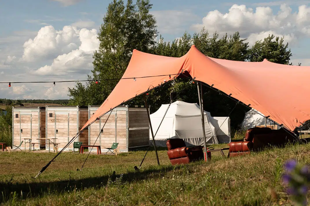 e.g. Housing wird auf längeren Festivals mitorganisiert: temporäre Schlafkojen, Mietzelte, Tiny Houses oder schlafen im Shuttlezug.