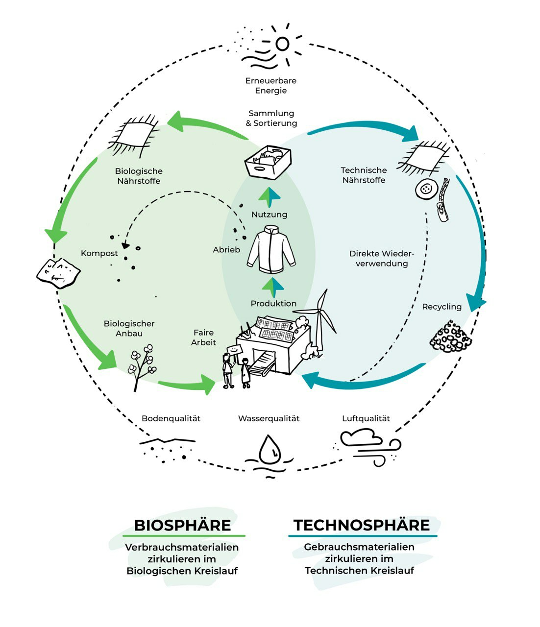 Ressourcenverbrauch findet in geschlossenen Materialkreisläufen statt also ein geschlossener Lebenszyklus von Dingen und Material. Nichts geht verloren.