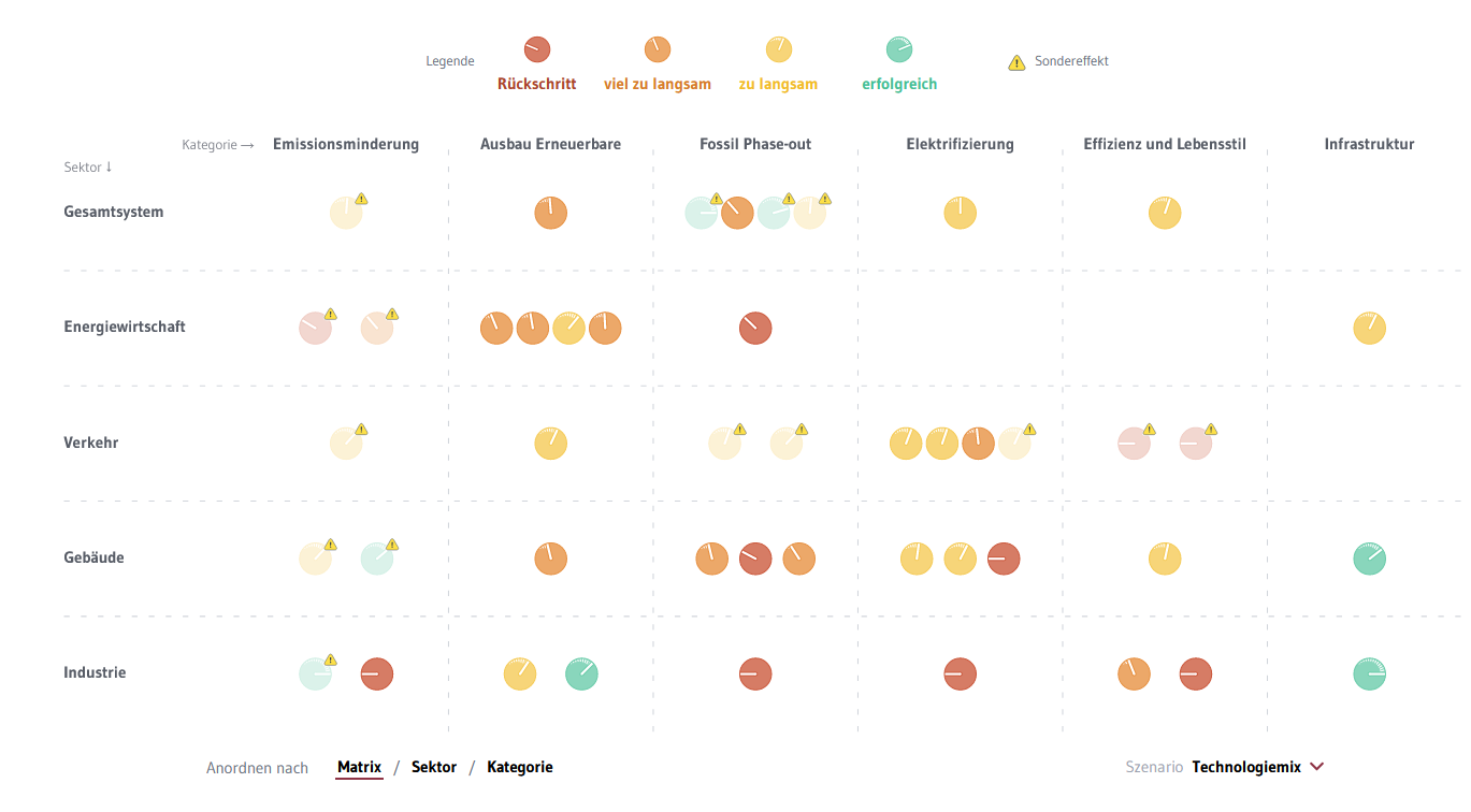 "Transformation Tracker" zum Fortschritt der Energiewende und Klimaschutzmaßnahmen in Deutschland: Ist die Energiewende auf Kurs? Um 2045 klimaneutral zu sein, muss das deutsche Energiesystem in einem nie dagewesenen Tempo umgebaut werden. Der Transformation Tracker nimmt vielfältige Indikatoren für den Fortschritt der Energiewende (z.B. die Anzahl von E-Autos oder den Anteil Erneuerbarer im Strommix) in den Blick und vergleicht Ist-Daten mit Zielpfaden aus den Ariadne-Szenarien.