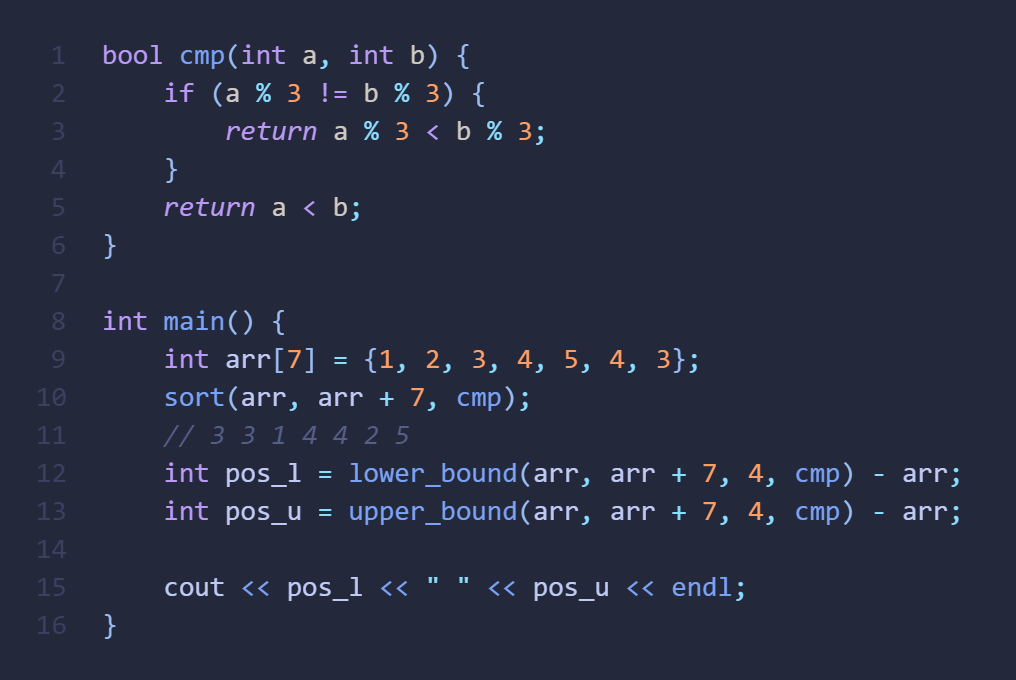 下例中,我們利用模 3 的餘數大小作為排序方式,如果一樣大才比較真實大小