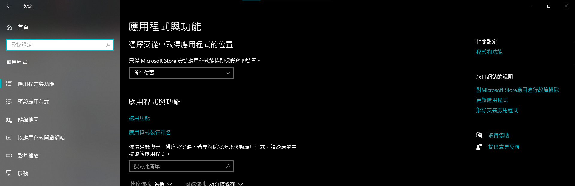 設定>應用程式>程式和功能