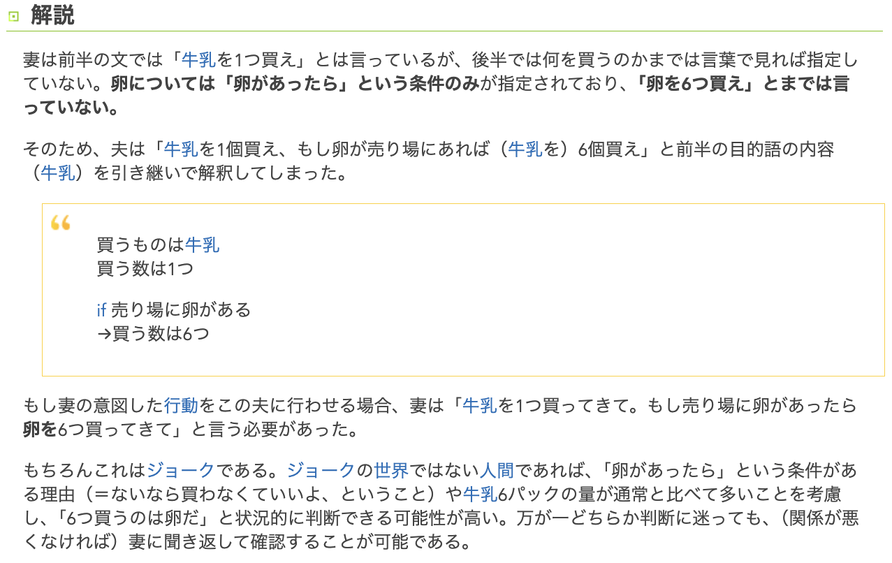 # 妻の依頼: 卵があったら(卵を)6個買って